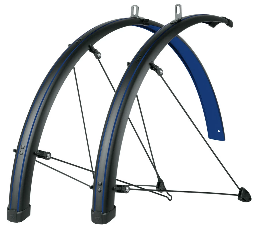 Jetzt kommt Farbe ins Spiel! Das SKS Schutzblech-Set BLUEMELS STINGRAY in matt schwarzer Optik mit farbigen Streifen verleiht dem Fahrrad einen tollen Style. Die schwarzen Streben und der Kantenschutz mit SKS-Logo machen den Look perfekt. Die coolen Schmutzfänger garantieren eine optimale Schutzwirkung gegen Spritzwasser und Dreck. Dank der flexiblen Sandwichkonstruktion, in der hochfeine Aluminiumstreifen in einer Kunststoff-Ummantelung eingebettet wurden, sind die Radschützer extrem robust, biegesteif und korrosionsgeschützt. Das Secu-Clip-Sicherheitssystem sorgt für ein Entkoppeln der Streben, wenn Zweige zwischen Schutzblech und Vorderrad gelangen, so dass das Rad nicht blockiert. Inklusive Strebensatz, Festbrücke aus Edelstahl und Montagematerial.